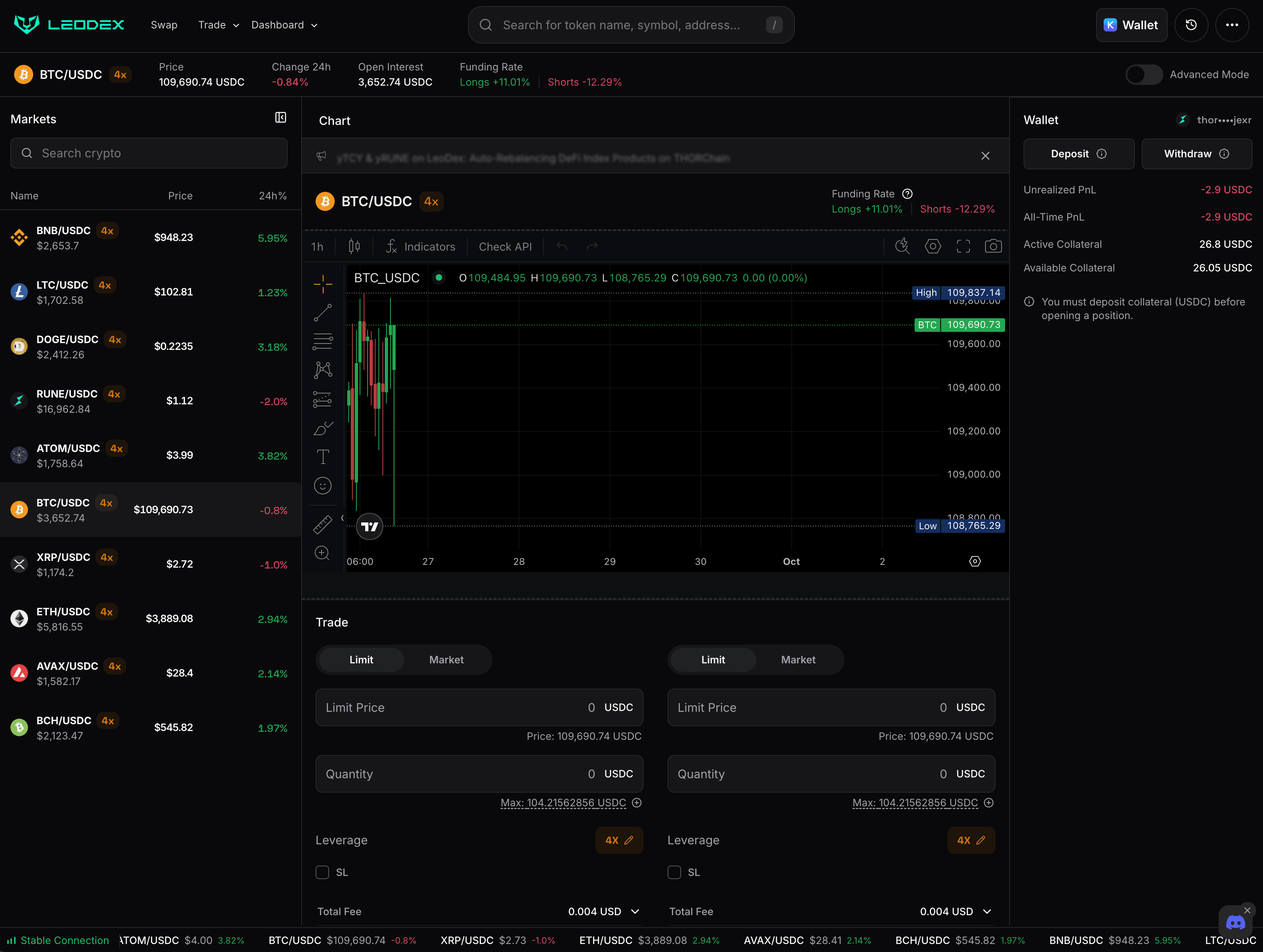 Remember: LeoDex Perps are fully onchain and decentralized. When you "Deposit" you are actually securing USDC on the THORChain network. This turns your ETH.USDC (for example) into Secured USDC on THORChain. This secured USDC can then be used for Perps trading.