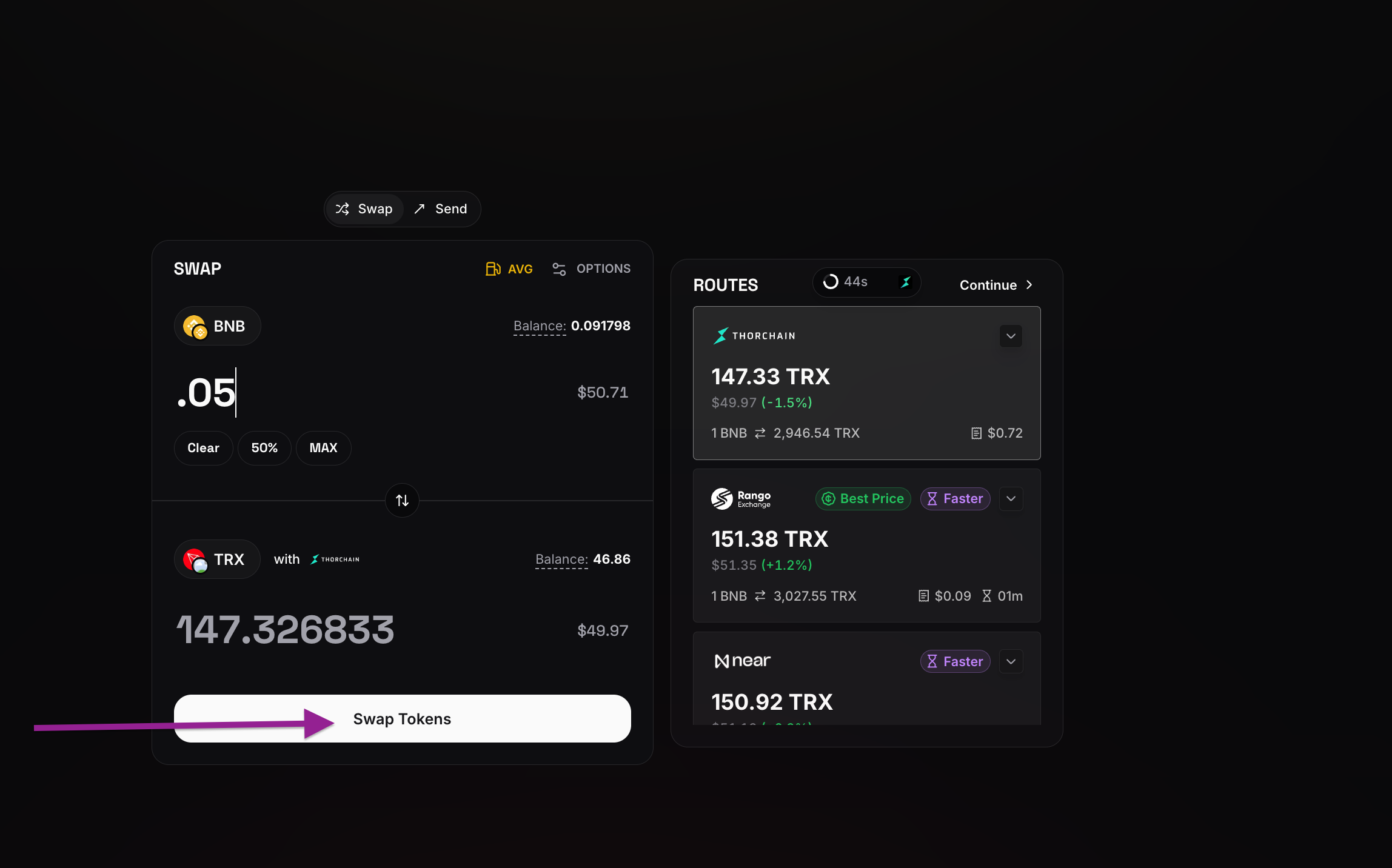 LeoDex offers the cleanest UI for THORChain routes while simultaneously bringing the fastest and lowest-fee swaps to the market for the ecosystem. With our built-in swap quoter, we'll find you the BEST swap price and speed for any L1 assets you want to swap across chains.
